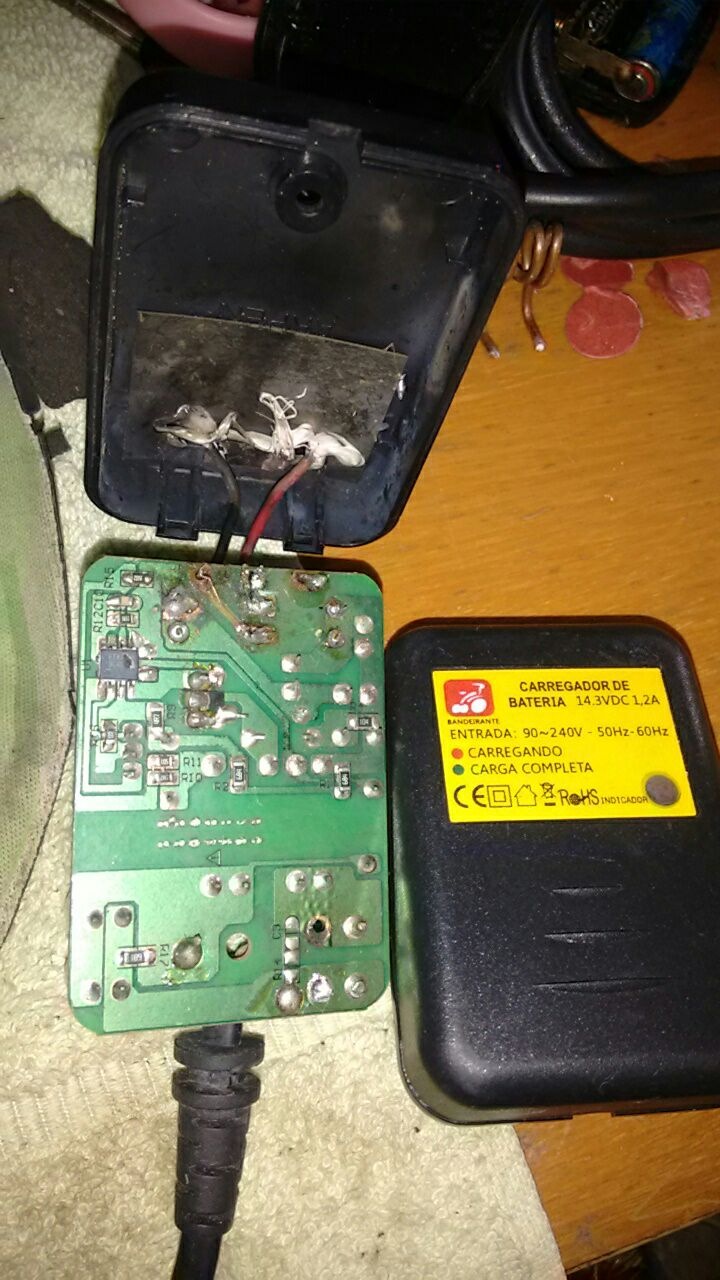 Este é o carregador bandeirantes para moto eletrica infantil, triciclo. O integrado estourou e nao se descobre qual o nome do ci. O transistor 5N80C está intacto. Alguem tem este carregador que possa identificar este CI? FT83..B
