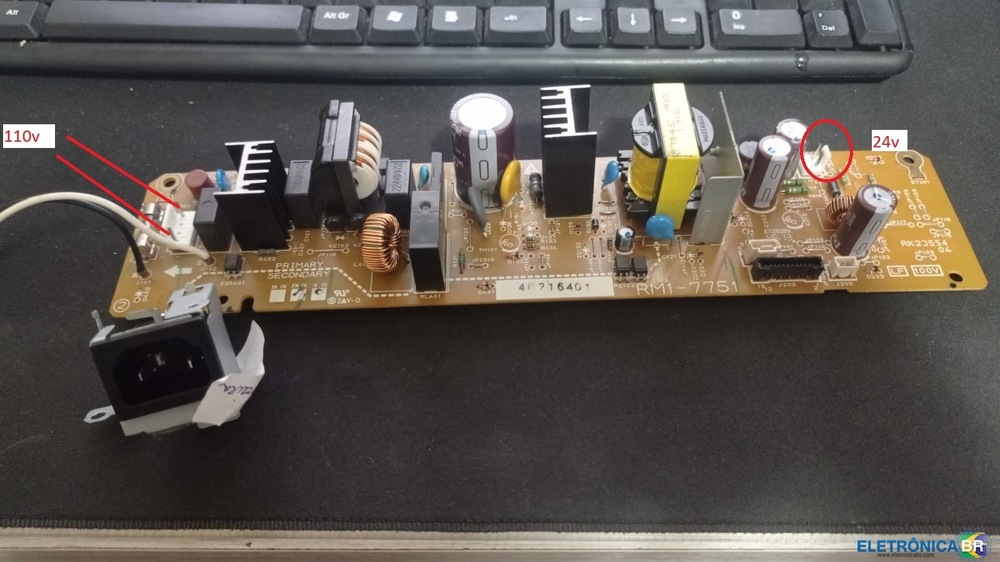 @Blucasd735 oi, pelo que estou vendo vc soldou o conector de energia no lugar errado, esses fios onde vc soldou são responsáveis por acionar a resistencia da unidade fusora! Estou indicando onde medir os 24v e também qual o local correto para soldar o conector de energia, veja fotos abaixo As dicas que deixo são: - Verificar curto na ponte retificadora; - Verificar curto no mosfet (percebi que ja tem um jumper ali) - Verificar o fusivel redondo ( vermelho) - Atenção para não ligar em 220v - Usar lampada em serie para efetuar o teste, pois em caso de curto não danifica os componentes.- 6 respostas