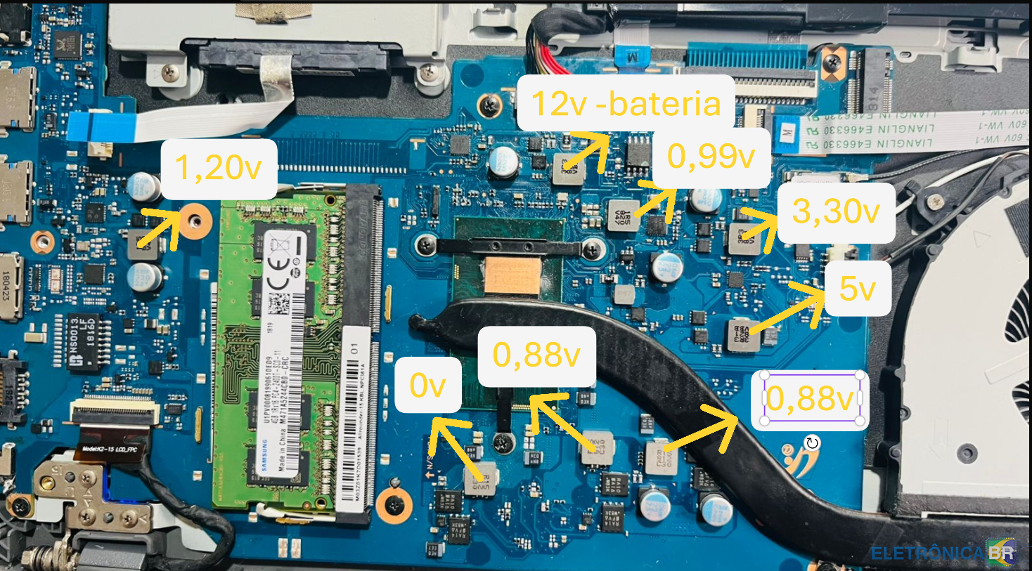 Tenho uma aqui que foi reparada, esta dando video e funcionando 100%, veja as tensoes com placa ligada Note que a minha tem uma bobina a mais, as duas com 0,88v. a sua esta um pouco acima, suspeito que pode ser bios A bobina com 0v provavelmente liga depois de usar o grafico do processador ou algo nesse sentido. A placa ligada esta consumindo 0,44A (retirei a bateria e usei somente fonte de bancada)- 18 respostas