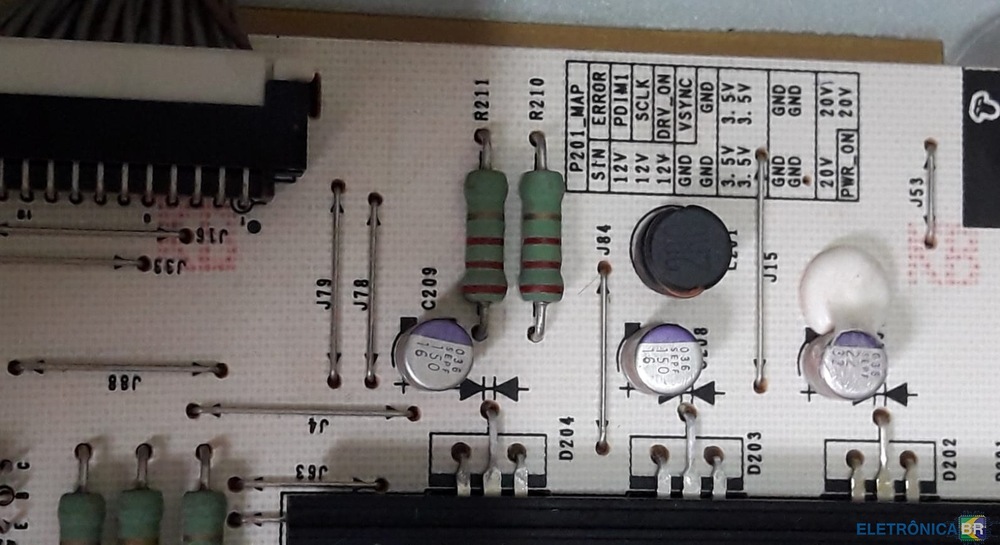 Nesse Multilaser não encontrei as entradas de alimentação nos lvds, como a placa está queimada não dá pra medir -