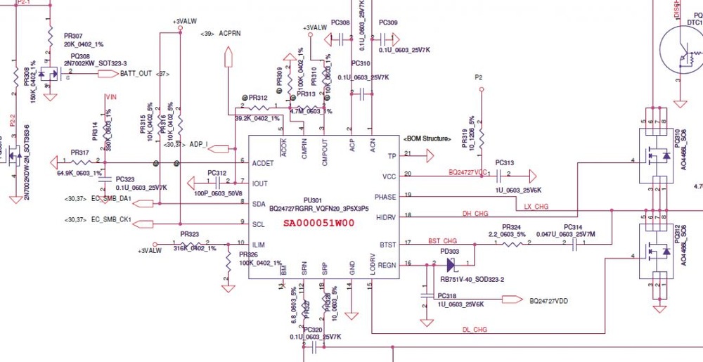 Verifiquei, então, o circuito integrado PU401 e encontrei alimentação, habilitação, LDOS, mas entrips desativadas. Curto circutei o mosfet PQ406 e as entrips foram ativadas aparecendo tensões de 3,3 e 5 Volts nas bobinas, e também 3,3 na Bios, no Botão Power e no Super-IO.
