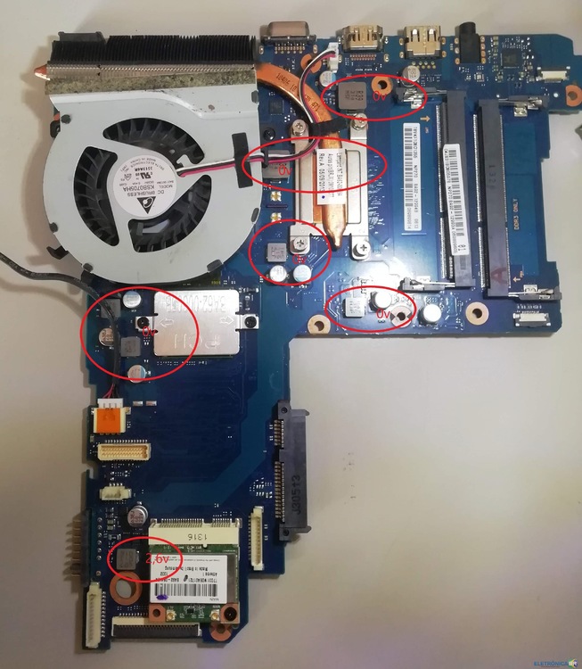 EDITADO: Ligava normalmente, agora não liga mais... não tem voltagem em nenhuma bobina. Notebook HP vermelho da série Beats estava com tela e touch quebrados, cliente solicitou somente a troca da tela. Após troca da tela não ligava, ficava com o led laranja acesso e ao ligar depois de alguns segundos led power fica piscando. Abri e retirei a bateria, realizei teste e tinha todas as tensões, e o mesmo ligou sem a bateria. Ao reconectar apresentou faisca em um terminal do capacitor, removido o capacitor mas o problema da luz piscando com a bateria continua. Com a bateria conectada apresenta tensão de 8v nos terminais da mesma na placa, a bateria desconectada mede 0.3v. Alguém ja passou por algum problema parecido ou pode me dar uma ajuda. Obrigado. Segue imagens da placa: -