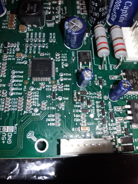 Em uma vistoria posterior à placa, vi que o resistor R63 estava torrado. Ele fica entre o Q8 e o Q6 próximo ao conector do painel.