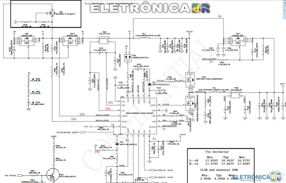 Quando peguei esta placa, ela não ligava. Após análise fiz a troca do mosfet de entrada 4466 e a placa ligou. Porém, ao conectar a fonte o led azul acende, ao pressionar power acende a luz laranja também (sem a bateria conectada) o cooler dispara, 5 segundos ele reinicia e fica em loop. Analisando pelo esquema descobri que o PWM está emitindo o sinal BATDRV pro comutador, com o carregador conectado e sem bateria. No ACDET pino 6 o sinal VIN chega no PR60, do outro lado fica oscilando em 6V. Quando encosto a ponta do multímetro nesta linha o LED azul apaga e a tensão estabiliza. Retirei o resistor pra testar fora mas acabei perdendo . Alguém poderia me informar qual a tensão tem que chegar nesse pino 6? E nesse caso, qual vou ter que encontrar um resistor de 280k pra substituir, correto? -