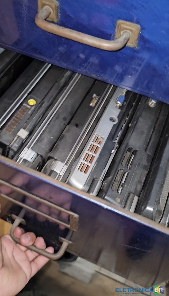 Entre os itens acumulados, encontrei notebooks com discos rígidos de apenas 60 GB, 120 GB e, no máximo, 250 GB — capacidades hoje insuficientes para aplicações modernas. Muitos utilizavam interfaces IDE antigas, memórias DDR2 SO-DIMM e telas LCD com matriz TN e proporção quase quadrada, obsoletas para padrões atuais.
