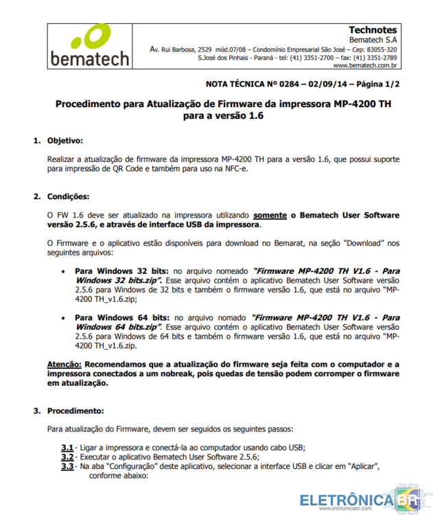 Realizar a atualização de firmware da impressora MP-4200 TH para a versão 1.6, que possui suporte para impressão de QR Code e também para uso na NFC-e. FW 1.6 deve ser atualizado na impressora utilizando somente o Bematech User Software versão 2.5.6, e através de interface USB da impressora. -