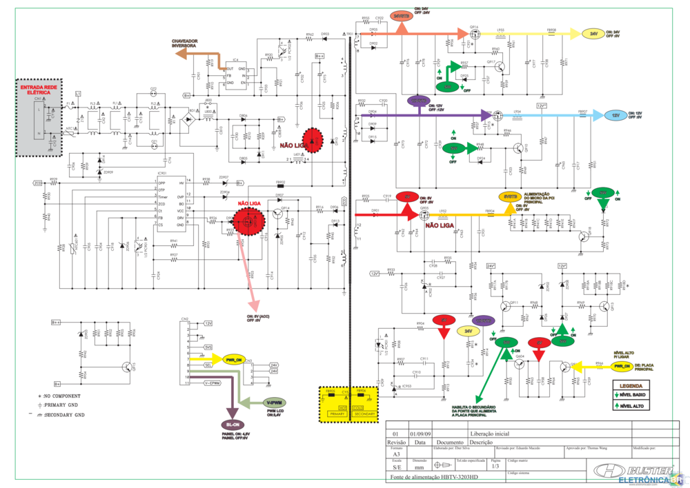 Defeito inicial: LED frontal sempre no verde, depois de algumas pesquisas e medidas nas tensões da placa lógica comprei a memória eprom já gravada, foi só trocar e a tv funcionar!