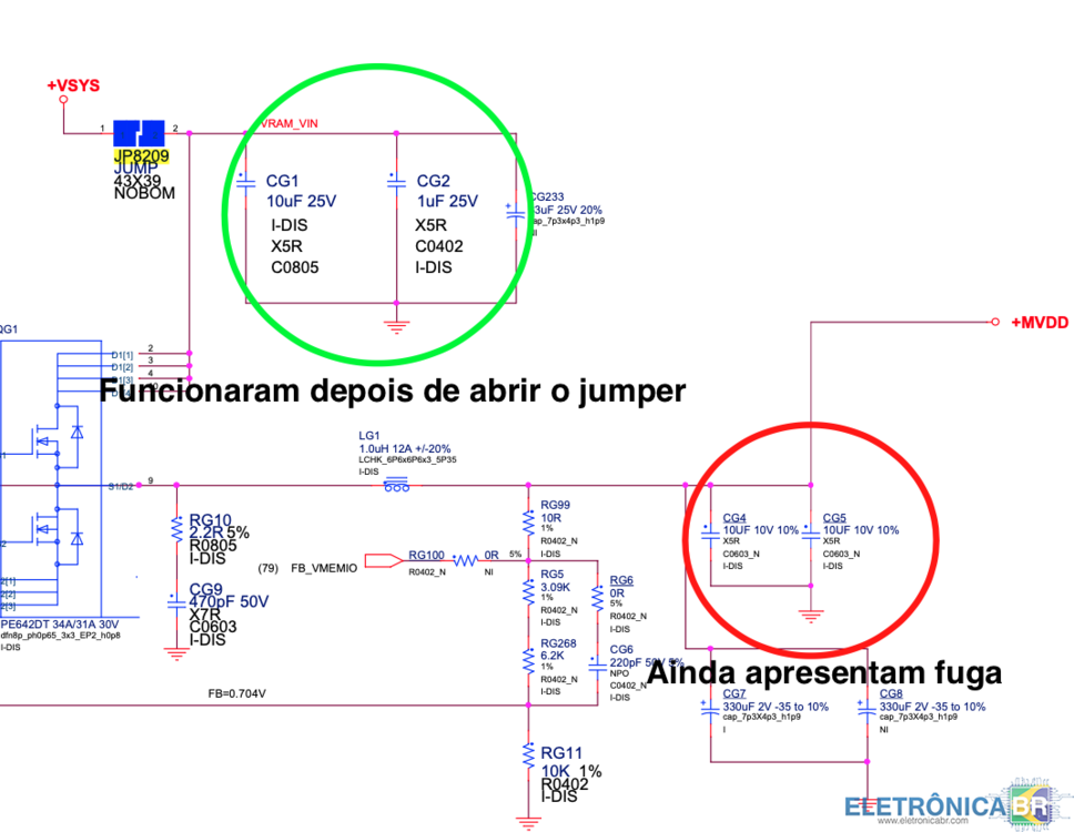 @master7 @gvnotebooks @CTM Informatica Bom Pessoal, hoje eu fiz uma varredura na placa. Enquanto não consigo uma fonte para realizar testes vou investigando e estudando, aprendi muita coisa esses dias. Antes de abri um Jumper do VSYS eu media os componentes daquele circuito, constatava a fuga, abria o Jumper e constatava que não havia mais fuga. Comecei pelo JP8204, tudo ok JP8205, tudo ok JP6100, tudo ok Ai cheguei no JP6303 citado pelo @CTM Informatica, quando abri comecei a testar e estava tudo ok, porém quando cheguei nos C6304, C6305, C6313...havia fuga, quando eu abri o JP6300 a fuga parou, e esse circuito se apresentou ok (imagem) Então vejo que o problema pode ser no +1.0V_PRIM, medi diversos capacitares que fazem parte dessa linha e todos apresentaram problemas, e vi que muitos levam a CPU (espero que não seja ela). Porém, ao medir a +VSYS no C867, C866 e R5903, a linha ainda estava em curto, aqui fiquei sem entender, então continuei. Abri o JP6701 e o JP6702 o curto nos C6703, C6704, C6729, etc pararam, porém do outro lado o C6739 apresentou fuga parece estar vindo do +VCC_CORE (imagem) Curto continuou no VSYS Abri o JP8209 e parou a fuga em CG1, CG2, mas continuo a fuga em CG4 e CG5 vindo do +MVDD Curto continuou no VSYS Abri o JP8211 e o JP8211, funcionou uma parte do circuito e a outra, ligada ao NVVDD apresenta fuga (imagem). E depois de abrir todos os jumpers do VSYS ele ainda apresenta fuga no C867, C866 e R5903. Se não tivesse aparecido as outras fugas no 1.0V_PRIM, VCC_CORE, MVDD e NVVDD acharia que tem algo errado no BATTERY CHARGER, mas com essas novas evidências vou precisar de mais investigação até conseguir uma fonte para injetar tensão. Com essa informações, o que vocês acham que poderia ser? Sigo qual linha para poder isolar o problema? Já que os jumpers acabaram. Outra coisa, será que consigo alugar ou pegar emprestado uma fonte assimétrica? pq comprar agora está fora de cogitação. Bom, sigo estudando e tentando arrumar a placa. Muito obrigado por tudo até o momento.- 31 respostas