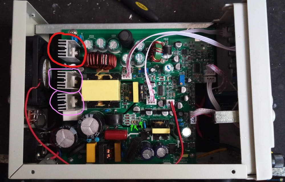 Fala pessoal, segue atualização do problema da Fonte de bancada. Examinei todos os capacitores SMD´s e os mesmos estão bons aparentemente, tinha dois que estavam com a resistência baixa, retirei da placa e testei com o capacimetro e nada. Logo após isso, testando a placa em busca de algum componente em curto, encontrei dois capacitores SMD e um resistor que estão sinalizados com as setinhas, os capacitores estavam bipando dos dois lados e o resistor não estava dando continuidade, retirei da placa e os componentes estavam bons, ressoldei na placa. Nisso tomei um belo choque neste dissipador de calor sinalizados de roxo, testei com multímetro em DC e nada, quando coloquei em AC o aparelho estava mostrando uma corrente de 60V nos dois dissipadores sinalizados em roxo e no vermelho estava com a voltagem oscilando, entre 4 e 7V. Retirei este transistor MBR3020CT a fonte não mostra a voltagem e está com a ventoinha disparada. Galera como é a maneira correta de testar este transistor? Fiz o teste com milímetro analógico na escala X1 colocando a ponteira vermelha no pino 2 e encostando nos pinos 1 e 3 e dá uma resistência de 4 oms, ao contrário não da resistência. No multímetro digital na escala de diodo/bip mesma coisa só mudando a cor das ponteiras. O teste é este mesmo? Sendo este o teste este transistor está bom ou ruim? Vou procurar outro transistor deste em sucata ou buscar por uma equivalência, qual seria? Comprar esta impossível, lockdown em Salvador até próxima segunda. grande abraço em todos. -