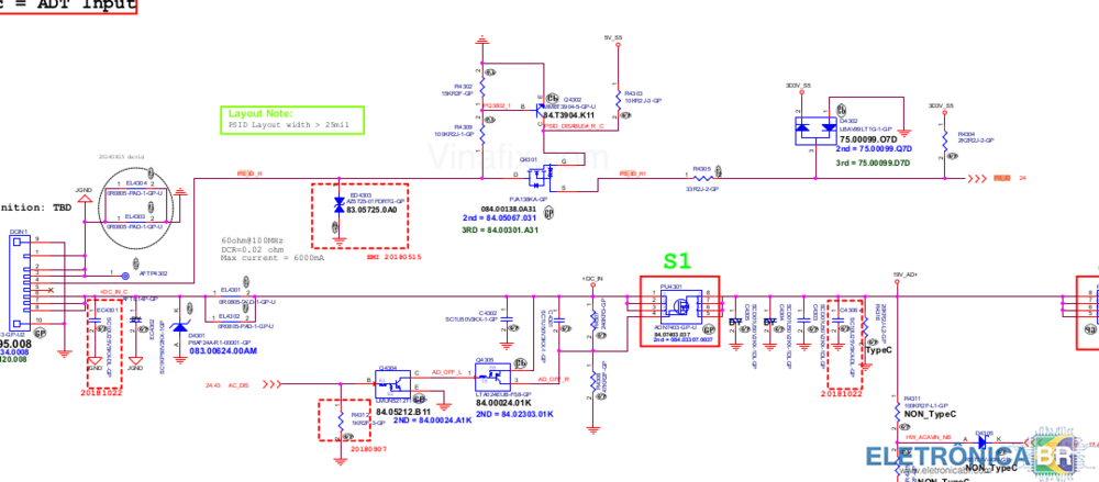 Boa tarde a todos, estou com esse notebook que chegou com o cliente relatando que não consegue instalar sistema por não reconhecer SSD, regravei a bios e está tudo ok essa parte. Porém percebi que não reconhece a fonte, testes com a Type C e está normal, somente na fonte de pino largo aparece esse defeito. Analisando a placa encontrei do lado contrario o PD4 torrado, ele é um PESD5V0U2BT, efetuei a troca porém continua sem reconhecer a fonte. Alguém poderia me ajudar nessa analise? Essa placa usa esquema similar. Analisando o entorno do pd4, pq2 e pq3 eu tenho os 3.3v alw e 5v alw. O 3.3v alw vai pro MEC5105, será que chegou a afetar esse cara? Muito obg. Encontrei aqui no forum.- 3 respostas