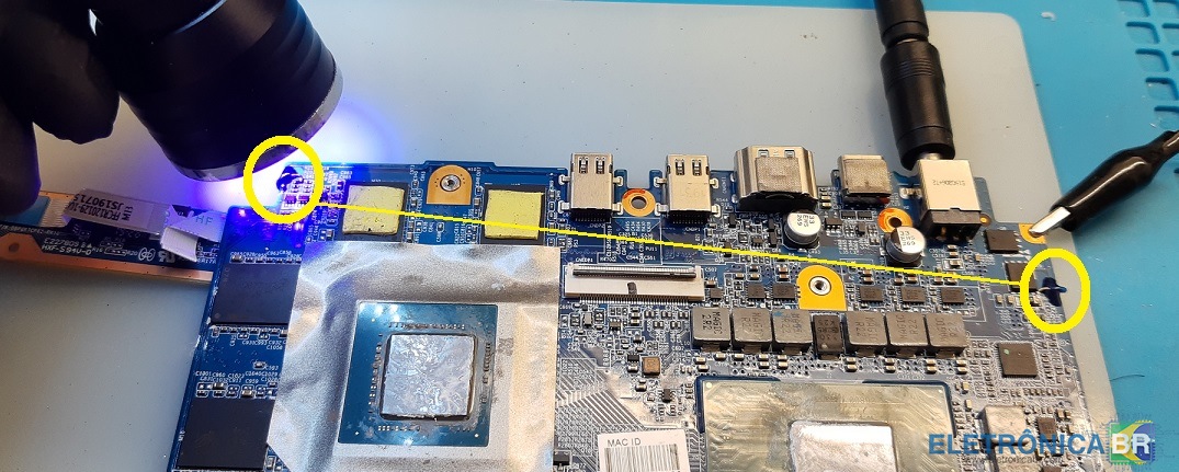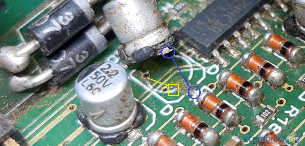 Já passei por uma situação similar, então fica a dica para os iniciantes no reparo de placas eletrônicas. Muita atenção ao reparas 'pads' rompidos: Observe atentamente se algum desenho(silk) passa sobre o 'pad' a ser reparado, não é impossível encontrar uma conexão por baixo da pintura e se desprezada, dependendo de sua relação, pode causar sérias "dores de cabeça"! A imagem mostra uma conexão que passaria despercebido facilmente. Sucesso a todos.:.- 2 respostas