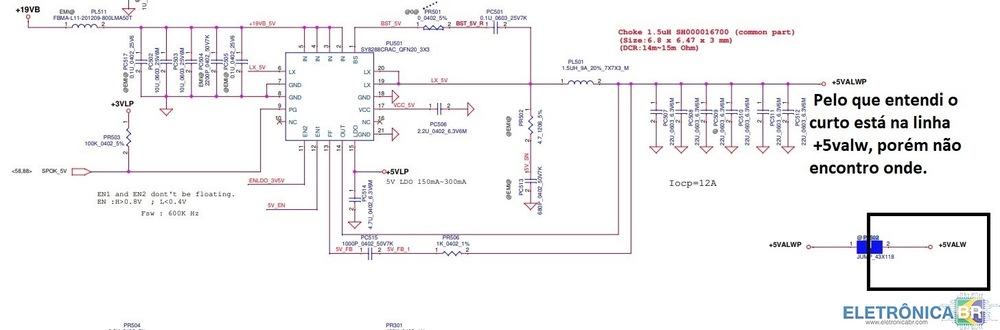 Boa tarde a todos. Estou com esse notebook da descrição sem ligar. Estava desarmando a fonte, e procurando cheguei até a PL4501. Levantando ele, a fonte para de desarmar e tenho 5v_pwr e 3d3v_pwr nas bobinas. Injetando 1.05v na saída da PL4501 tenho consumo de 0.416ma, e PCH a 30°. O que me deixou intrigrado e não consegui encontrar a razão é que no pad de entrada da PL4501, se alimentar a placa com 19v, estão chegando 16v. Caso baixe essa PL o curto volta. Na câmera o unico sinal de aquecimento que tenho com a PL levantada é a PCH a 30°. Estou usando esse esquema, com a PL4501 na página 45. Poderiam me orientar nessa análise, por favor? -