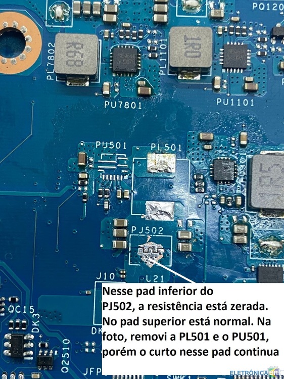 Vi agora a mensagem. Ia postar mas é o mesmo que o @Ponto da Manutenção postou. Fica o aprendizado para a próxima. Abri o PJ502, e apenas um pad dá resistência baixa. Daí para soldar o fio para injetar tensão fechei ele e removi a PL501. Na placa, o PJ502 está colado na PL501. No boardview ele aparece em outro ponto, mas com a mesma função. -