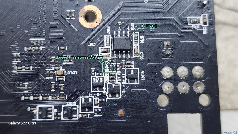 Removi chip e fiz reballing nele, Voltei pro lugar mais a Tv ficou foi sem imagem direto, Não aparecia mais nada de imagem! Eu tinha conseguido com um colega uma placa praticamente da mesma porem mudava o modelo mais os componentes eram os mesmos da placa original, Quando coloquei essa placa a Tv veio com imagem e com linhas de 5 cemtimetros pretas.