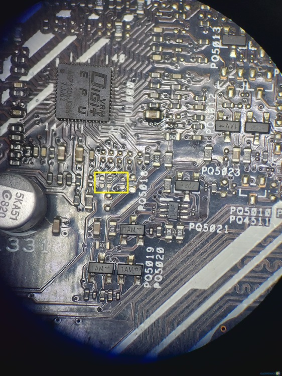 Pessoal esses dias deu entrada em minha bancada essa placa mãe com os seguinte sintomas: Ela "liga", tem todas as voltagens principais e etc. Porém ao pressionar o power o cooler gira normalmente, porém sem vídeo. Bom, assim iniciei um rastreamento do defeito, com algumas técnicas e medições. Descartei hipótese de ser memória ram e processador, pois tenho eles em perfeitas condições. Regravei bios, substitui ci de bios, e o defeito permanece. Instalei uma vga off-board pra teste e um fato interessante ocorria. Ao ligar, a vga gira os fans, porém para em 1 segundo, o cooler da cpu gira normalmente o dissipador tem um aquecimento normal também. Nessa jornada me deparei com um detalhe, notei a falta de 3 componentes próximos ao ci PWM, que foram literalmente arrancados por fricção. A seguir na imagem destacado em amarelo. Tentei buscar esquema elétrico, porém sem sucesso, até mesmo o datasheet do ci PWM(ASP1106JGQW), não encontrei. Me restou apelar aos amigos do fórum, alguém que porventura possa ter uma placa do modelo referido e possa me ajudar repassando o tipo e valor dos componentes faltantes. De antemão agradeço a todos e espero que juntos possamos resolver este tópico. -