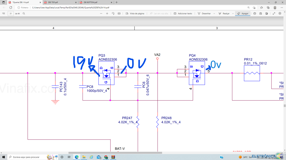 Boa noite turma, esse notebook é de um amigo, segundo ele desligou do nada e não ligou, nesse meio termo ele achou que era o carregador e levou para testar em outro e vice versa e nada, ai ele carregou a bateria no outro e notou que o ao voltar a bateria o note ligava, porem o carregador não era acionado. aqui trouxe para mim sem carga nenhuma e consegui ver que ele chega os 19v no mosfest e no outro lado da placa perto do pwm ele chega 19v de um lado do componente e do outro sai 2.87. do lado vermelho tem 19v e do lado azul a outra voltagem. a placa ta morta