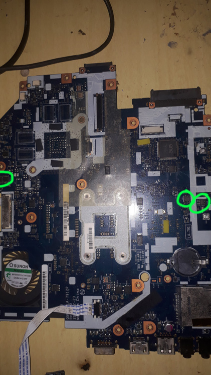No começo pensei que fosse a fonte troquei a mesma testei com o multímetro e esta funcionando, depois troquei o conector da fonte e não deu nenhum resultado, notei que a placa estava um pouco oxidada então lavei com alcoo e ressoldei os pontos de solda nada também, depois regraveis as duas bios que essa placa tem não deu resultado também, depois fui medir as tensões primarias 19v, 5v e 3v e ta chegando essas tensões, fui olhar a frente da placa aonde tem as bobinas e a bobina de 5v e de 3v estão ok mais a de 0,9 e 1,5 não tem voltagem cegue a imagem das bobinas que não tem voltagem elas estão circuladas de vermelho, os círculos verdes foi onde eu medi as tensões primarias, a detalhe ambas as bios estão sem voltagem nenhum pe dela esta mostrando voltagem ! oque eu faço agora ?