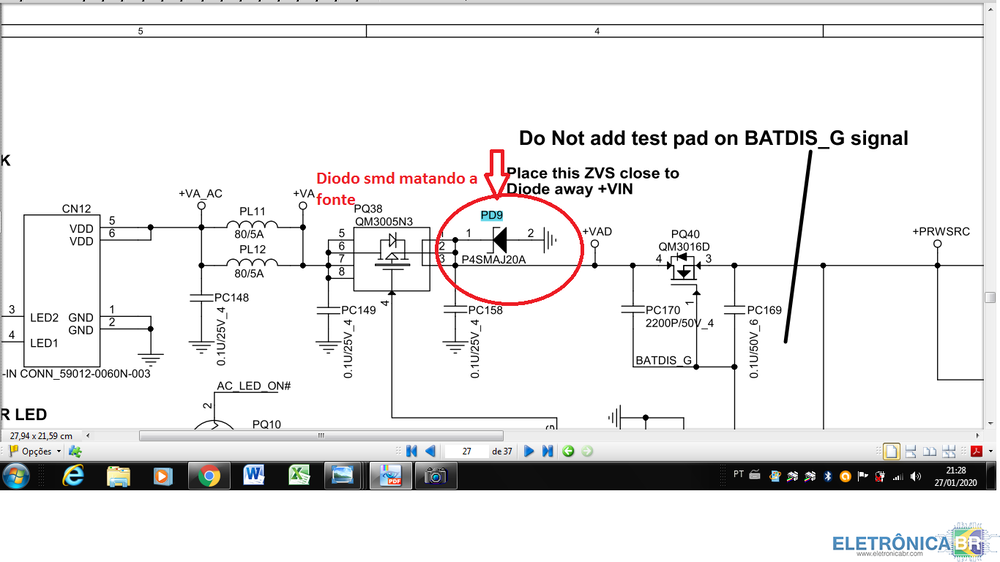 Olá amigos de bancada,estou com essa placa na bancada,placa em curto,ao conectar o carregador ,mata a fonte, Observando e pelo esquema vi que as tensões de entrada estão oscilando. Chega os 19 v no jack e decsonfio que seja esse "diodinho" que esteja em curto,desarmando a fonte. pesquisei um similar,equivalente,mas não sei pelo qual posso substituir para testar a placa. Podem me ajudar? HP Pavilion ProtectSmart/HP /MOdelo: 14-b065br placa daou33mb6do rev: D/matando a fonte.- 5 respostas