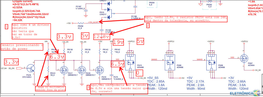 Bom dia pessoal! Estou com essa placa na bancada, ela chegou com uma forte oxidação no LED 3 e LED5, e após fazer uma limpeza, a placa chegou a dar vídeo, aparecendo a logo da Acer. Desliquei ela, e fui ajeitá-la melhor na carcaça e aí, passou a não funcionar mais. Tenho tensôes estáveis no PU5. PU5 - (PWM de 3 e 5v) - 3v e 5v (Não tenho o Pgood, pino 23, achei estranho) Bom, medindo a sequencia de power da placa, vi que a +3V_S5 chega uma tensão de 0.68v e a placa desliga. Analisando o circuito da +3V_S5, vi que no PQ17 eu tenho os 3.3V após o start, até a placa se desligar. O que estranhei foram os pontos 1, 2 e 3 comentados abaixo. Ponto 1 - Faz sentido eu ter 6.3V, mesmo as resistencias (PR140 e PR141) estando com 1M cada? Ponto 2 - Faz sentido eu ter 12.8V, mesmo a resistencia PR256 estar com 24K? Ponto 3 - Faz sentido eu ter 6.5V, onde eu teria que ter, pelo meu entendimento, mais de 15V? Obrigado galera! Fui medir