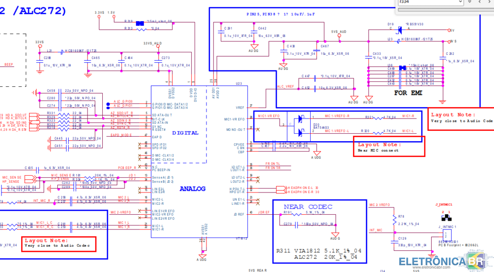 Olá amigos. tenho uma placa dessa no meu cemitério sem som. de começo ela nem reconhecia o dispositivo. chip de som (U23) estava sem alimentação. estava sem as bobinas L21 e L23. Coloquei as bobinas, ela reconhece o dispositivo mas sem som nos falantes internos. no externo funciona. A linha HP_SENSE muda a resistencia quando pluga um externo. Como era fácil, já troquei pra testar o chip de audio (U23) e o amplificador (U22), sem mudanças. U22 tem alimentação também pela L34. -