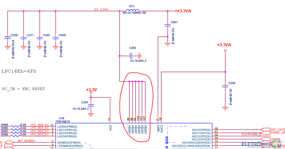 Link do esquema. Ola amigos, analisando esse caso, visualmente encontrei o r268 próximo do conector da bateria aberto, troquei o mesmo e o note ligava dava vídeo, porem de maneira intermitente, tinha vez que não ligava nem a pau. Analisando as tensões notei que no bios, pino 8 tinha as vezes 3,3v e as vezes 2,2v, algo errado né, seguindo o sinal dessa linha de tensão, que seria o +3.3VA, comecei a estudar junto ao esquema de onde é gerada essa tensão de +3.3VA que estava oscilando. Então na pagina 37 (VCC SW/+3.3VA/HIGH-SPEED CAP), descobri que o +3.3VA é gerado pelo CI U1, o mesmo estava com defeito, troquei e funcionou perfeitamente. Ele fica em baixo da placa wifi -