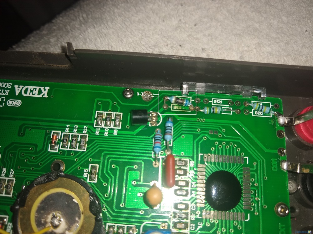 Pessoal, Boa Noite. Estou com um Alicate Amperímetro da Mesco DC-3266, ele está com o resistor R35 Carbonizado e não consigo identificar o seu valor. Um detalhe que verifiquei é que sua placa eletrônica é da KEDA. - Alguém têm essa informação ou até mesmo um aparelho semelhante, que possa informar o valor desse resistor? Vou postar fotos do aparelho para uma melhor informação. Obrigado a Todos.