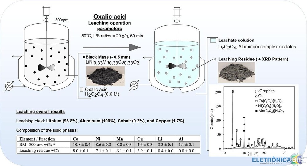 O conteúdo triturado de uma célula de bateria de carro gasta (saco prateado), na forma de um pó preto finamente moído (prato à esquerda), é dissolvido em um líquido transparente, o ácido oxálico. Após um tempo preciso, a mistura preta é filtrada. O alumínio e o lítio vão parar no líquido (azul esverdeado), enquanto os demais metais, como cobalto, níquel e manganês, ficam nos sólidos escuros (prato à direita). [Imagem: Anna-Lena Lundqvist/Chalmers University of Technology] Reciclagem das baterias automotivas Engenheiros suecos acreditam ter encontrado finalmente uma solução para a reciclagem das baterias dos carros elétricos. Embora a pegada de carbono desses veículos seja muito menor do que a dos veículos a combustão, a reciclagem das baterias ainda é um problema não resolvido, representando um passivo ambiental significativo para a eletrificação dos transportes. O novo método permite a recuperação de 100% do alumínio e 98% do lítio nas baterias dos carros elétricos. Ao mesmo tempo, a perda de matérias-primas valiosas, como níquel, cobalto e manganês, é minimizada. Nenhum produto químico caro ou prejudicial é necessário no processo porque os pesquisadores usaram ácido oxálico, um ácido orgânico que pode ser encontrado no reino vegetal. "Até agora, ninguém conseguiu encontrar exatamente as condições certas para separar tanto lítio usando ácido oxálico, ao mesmo tempo removendo todo o alumínio. Como todas as baterias contêm alumínio, precisamos de ser capazes de removê-lo sem perder os outros metais," diz Léa Rouquette, da Universidade de Tecnologia Chalmers. O método de reciclagem de base aquosa é denominado hidrometalurgia. Na hidrometalurgia tradicional, todos os metais de uma bateria automotiva são dissolvidos em um ácido inorgânico, quando então se coleta metais como alumínio e cobre. Por último, são recuperados separadamente cobalto, níquel, manganês e lítio. Embora a quantidade de alumínio e cobre residual seja pequena, são necessárias várias etapas de purificação e cada etapa deste processo pode causar perda de lítio. Com o novo método, os pesquisadores inverteram a ordem, recuperando primeiro o lítio e o alumínio. Assim, é possível reduzir o desperdício de metais valiosos necessários para fabricar novas baterias, que se perdem nos métodos convencionais. A inversão do processo e o controle preciso das etapas permitiu um nível inédito de recuperação dos metais das baterias. [Imagem: Rouquette et al. - 10.1016/j.seppur.2023.124143] Hidrometalurgia das baterias Tudo começa pulverizando-se o conteúdo da bateria, gerando um pó escuro muito fino que é dissolvido no óxido oxálico. Parece simples, mas o processo envolve um criterioso controle da temperatura, da concentração e do tempo. Finalmente, a mistura é filtrada, restando algo parecido com uma borra de café - o alumínio e o lítio ficam no líquido e os outros metais ficam na parte sólida. Fica faltando então a próxima etapa do processo, que consiste em separar o alumínio e o lítio, mas a equipe afirma que esse não será um problema. "Como os metais têm propriedades muito diferentes, não achamos que será difícil separá-los. Nosso método é uma nova rota promissora para a reciclagem de baterias - uma rota que definitivamente merece mais exploração," disse Rouquette. Fonte: https://www.inovacaotecnologica.com.br/noticias/noticia.php?artigo=finalmente-receita-reciclar-baterias-carros-eletricos&id=010125231023