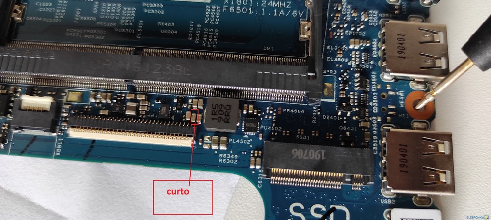 Boa tarde! Estou com esta placa, apresentava falha 3 laranja 5 branco sempre ao ligar, placa fora do notebook. Após análise, próximo da memória existia um capacitor em curto PC4515 linha de 5v foi removido e a placa persistia na falha led 3laranja 5 branco(Falha no rail de energia). Ao realizar troca de super IO placa apresenta característica normal 2laranja x 3branco sem memória, só que a tensão de 1,2v não está presente. -