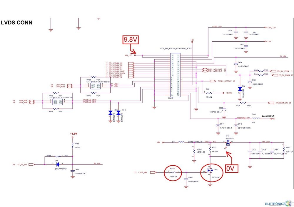 Boa noite amigos, estou com um Notebook CCE Ultra Thin U25, Placa NH4CU53 com tela branca ,porém funciona com monitor externo perfeitamente. AS tensóes no conector CN16 estão corretas, porém não tenho tensão no gate do transistor Q42.Não consigo encontrar o transistor Q44 e nem o resitor R422.Esse esquema em anexo é o LVDS -
