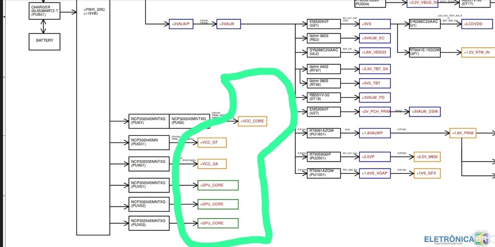 Bom dia pessoal. Estou com esse notebook aqui na bancada em resumo, o cliente trocou a bateria que estava viciada por uma nova. após isso, o notebook morreu, nem o led1 que indica presença do carregador acende mais. Tentou colocar a bateria antiga de volta mas não resolveu. Em analise, confesso que estranhei bastante o esquema. o CI de charger é diferente de todos que ja vi, e estou com muitas dificuldades. Em resumo, a tensão +PWR_SRC, que alimenta todos os CI's da placa, não está presente. Estou batendo em cima do CI de charger. o que medi até agora: Pino 8: (VDDP) - 5.43V Pino 17 (DCIN) - 19.56V Pino 18 (VDD) - 5.45V Pino 19: (ACIN) - 0V Pino 24: (ACOK) - 2.52V Pino 3: (VSYS) - 0V por favor, qualquer ajuda é bem vinda. segue esquema utilizado -