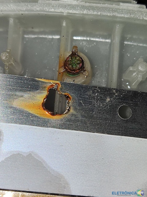 Após abrir, me deparei com isso, a resistência não queimou, apenas o ponto de contato que se desgastou por não ser soldado, mas sim "crimpado" de uma forma ruim para a quantidade de amperes que passa por ali.
