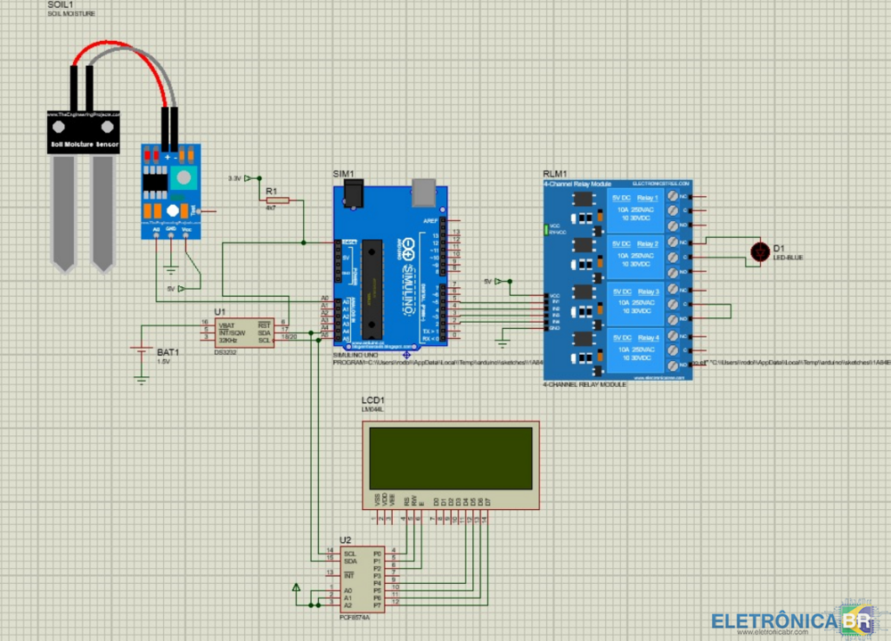 Estou com um circuito simulando a automação de sistema de irrigação utilizando o Arduino. Alguém consegue verificar se meu circuito esta correto?