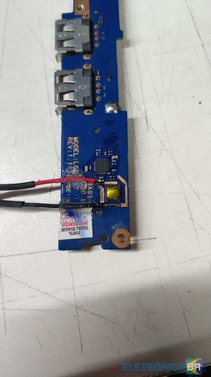 O Notebook liga, carrega normal, porém está com mau contato na placa BA92-09691A, preciso de um meio de ligar um switch padrão de desktop no lugar do botão de energia, cheguei a fazer essa ligação mas não entendo muito da parte eletrônica, tentei achar o diagrama da placa na internet para verificar onde posso dar o curto para ligação porém não sei se é assim que funciona. segue foto da adaptação que fiz e que não funcionou. -