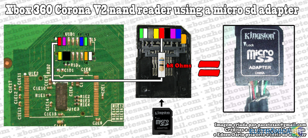 Gente tentei fazer o desbloqueio do Xbox 360 rgh pelo AutoGG... Usei um adaptador de cartão sd, soldei todos pontos de leitura do cartão conforme um esquema que eu vi(o esquema da foto abaixo)(fiz o aterramento do cristal para poder ler), ele leu a nand de boa mais na hora de escrever o Shell nele ele aparecia um erro (Erro 13)como se tivesse bloqueado para gravar a nova nand... Dps disso tentei pelo jrunner e acabei apagando a nand sem querer eu acho, agora ele não liga e nem dá sinal de vida. Alguém me ajuda por favor kkkk tô fudido-