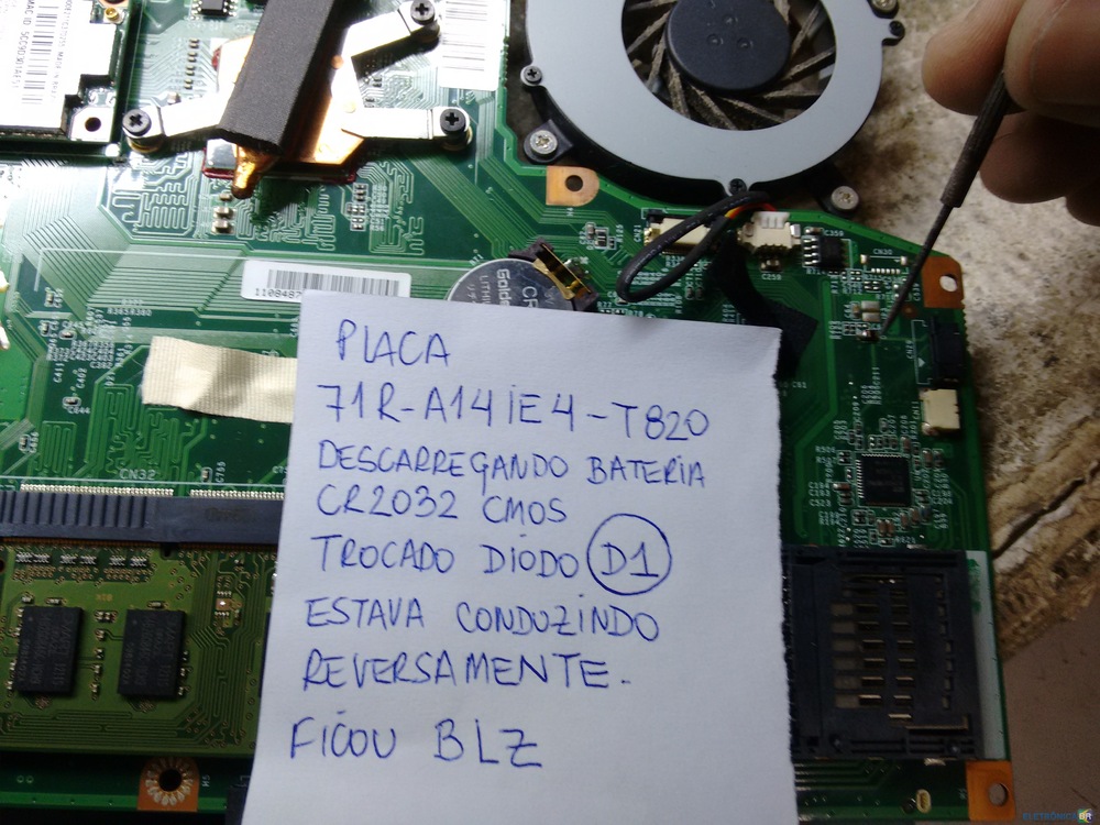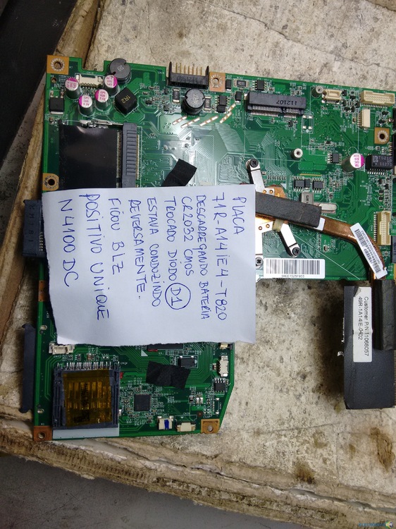 Notebook Positivo Unique N4100, entrou aqui na oficina perdendo data e hora e descarregando CR2032, foi constatado curto no diodo D1. Foi substituido e voltou a funcionar normalmente. Segue fotos para visualização: Se a dica foi util nao esqueça do joinha -