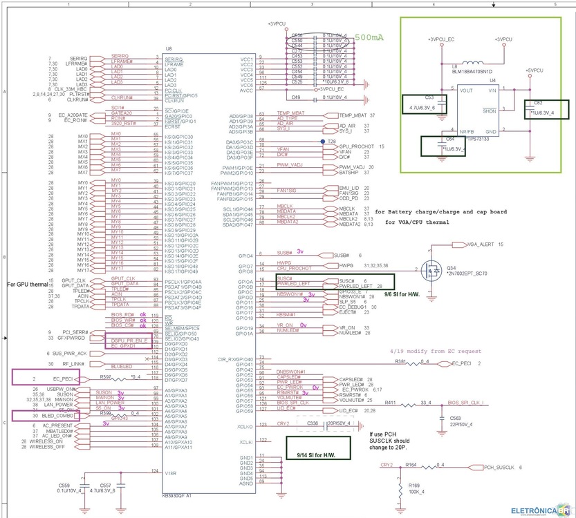 Boa noite pessoal. Gostaria de uma grande ajuda dos amigos. Estou com esse equipamento na bancada, estava funcionando normalmente, foi desmontado para dar uma limpeza geral e troca de teclado. Assim foi feito, porém durante a montagem ocorreu um problema que gerou o defeito citado. O cabo do alto falante que vai para o lado direito (vermelho e preto) (pinos 3 e 4) do Cn1 erroneamente ficaram muito próximo do conector CN7 que vai conectado o cabo que atende ao cd-rom. Quando foi conectado este conector ele trancou o cabo de áudio e junto a carcacinha pelo lado de fora do pino 1 deste conector e perfurando o fio que acabou ficando em contato com o terra do conector e ali ficou furado e preso tanto o preto como o vermelho. Logicamente que não foi notado, máquina montada, ainda com a bateria apenas a máquina foi ligada, e ficou um ruído no alto falante direito, porém foi subindo o sistema, notei um cheiro mais forte (tipo de queimado) e sente ele quente ali na proximidade do leitor de cartão, já mandei logo desligar o sistema. que desligou normal. Fiz o desmonte da peça e aí que notei tudo que relatei acima, tirei o fio do lugar e fiz um teste e a máquina agora não dá mais vídeo e fica apenas ligando e desligando, sem apresentar vídeo. fiz umas medições pela placa e ao ligar ela manda os 3.3 para a bios mas logo em seguida zera. comecei a fazer umas medições e notei que o Pq39 e Pq40 apresentavam curto, tirei eles da placa, e fora tudo certo. continuei os testes, e notei que o Pc255 apresenta curto em relação ao terra em ambos os terminais. Removi ele, medi fora e está ok, porém mesmo sem o componente os terminais apresentam curto em relação ao terra. O PL25 tinha o mesmo curto mas ao remover ele, o curto ficou apenas na linha que ia em direção ao Pc255. Removi todos próximos a esse capacitor, no caso o Pc249, pc250, pc251, pc252, pc253 e Pr239. O curto permanece em ambos terminais do pc255. Olhando o esquema cheguei ao L50 e L53, removi ambos, o curto se mantém, fiz também a remoção do c620 e o mesmo curto permanece nos terminais mesmo sem o componente. Alguém poderia me dar uma luz a mais ? Estou usando esse esquema- 9 respostas