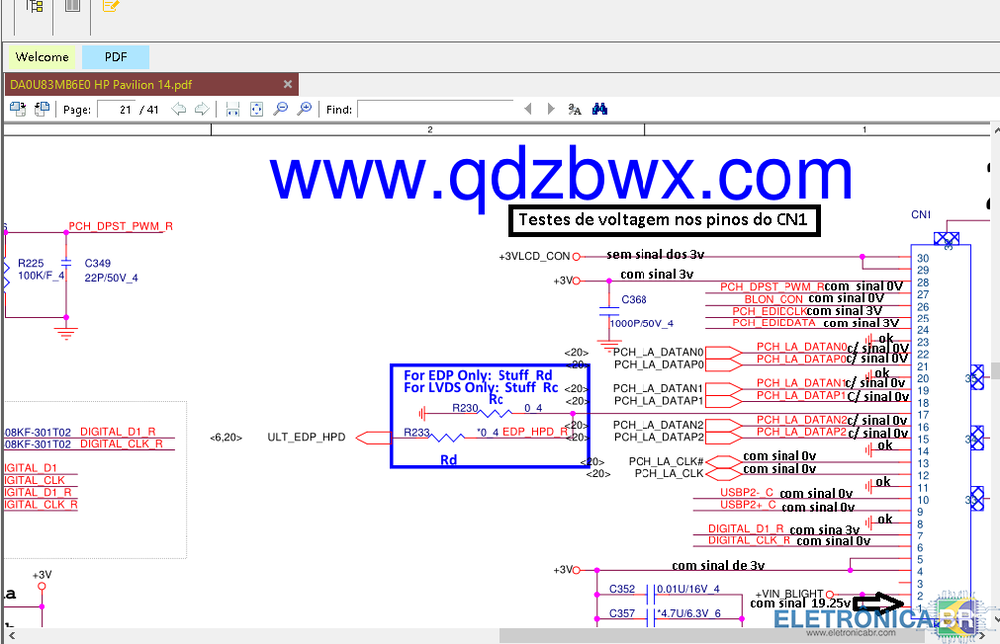 Olá amigos. antes de tudo é bom frisar que estou iniciando no concerto de placas de notebook... Então, esse notebook chegou pra mim com problema de tela branca. Fiz alguns testes básicos... Antes de partir para a placa. A tela está boa, o cabo flat está bom e está dando vídeo normal pelo HDMI. Fiz alguns testes de tensão no CN1 onde vai conectado o cabo Flat da tela... deixarei a imagem com as tensões que estão chegando até o CN1 Nos pinos 29 e 30 como podem ver não tem a tensão de 3v.. quando eu injeto a tensão de 3v nesses dois pinos a tela fica preta e não dá sinal de video. Outro fato que é interessante de destacar aqui é que o único esquema que eu encontrei foi ( DA0U83MB6E0 ). E na placa o modelo que está é ( DA0U83MB6E0 REV : E ), nesse esquema que eu encontrei falta alguns componentes no setor LVDS... Estou achando que o motivo seja pq não é Rev: E. Se alguem puder me ajudar agradeço. -
