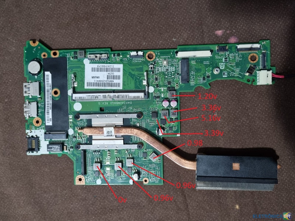 boa tarde esse notebook esta ligando com consumo de 0,180 na fonte assimetrica o processador apenas fica morno, tenho todas as tensoes 3v, 5v, 19v, bios esta sendo alimentada tenho 1.80v no ci do vcore nas bobinas perto do processador apenas 1 tenho voltagem esta entrando 8v e saindo 1.05v acredito que as outras 2 bobinas so apresentaram voltagem no momento em que for exigido mas do processador me corrijam se estiver errado -