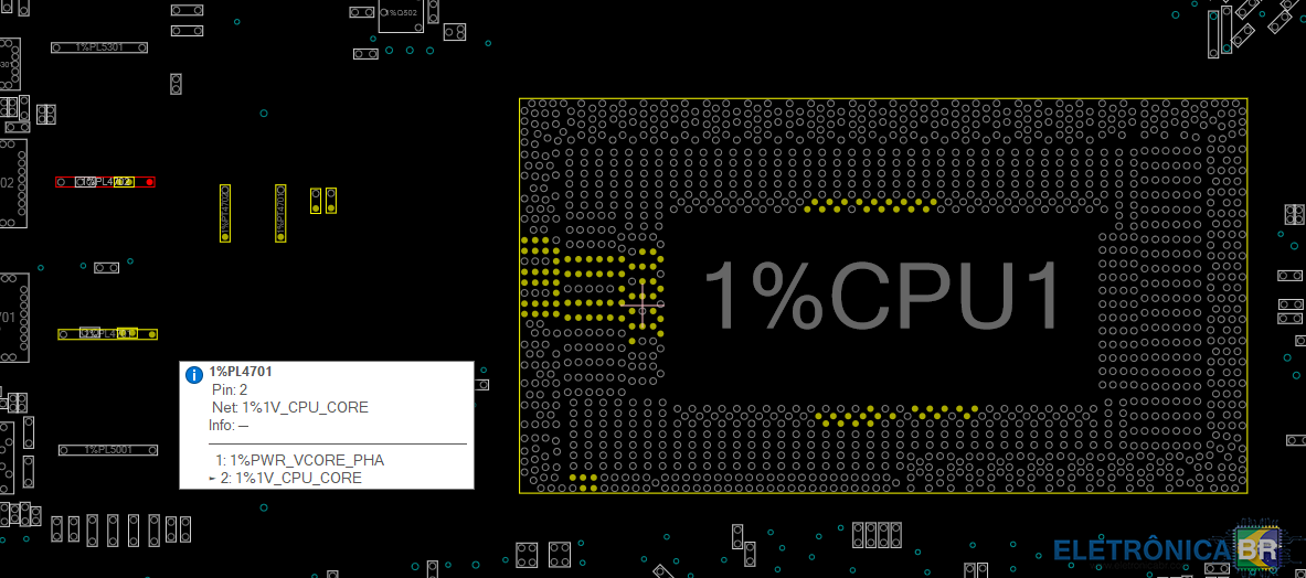 Estou com essa placa que não está ligando, na minha opinião é processador em curto. As bobinas PL4701 e PL4702 no lado 2 delas, linha do 1V_CPU_CORE, apresenta curto. Já levantei as bobinas e injetei 1v (não foi com fonte assimétrica), consumiu tudo e nada aqueceu. Anexar imagens do esquema vai ocupar muito espaço então printei o board: Nesse lado da placa tem somente estes componentes na linha, como estava fácil já testei esses capacitores, estão OK. Lembrando que essas duas bobinas ali estão levantadas. Já n outro lado da placa também tem apenas capacitor, resistor e um diodo. Realmente é o processador nesse caso ou tem algo ainda que dá pra fazer?