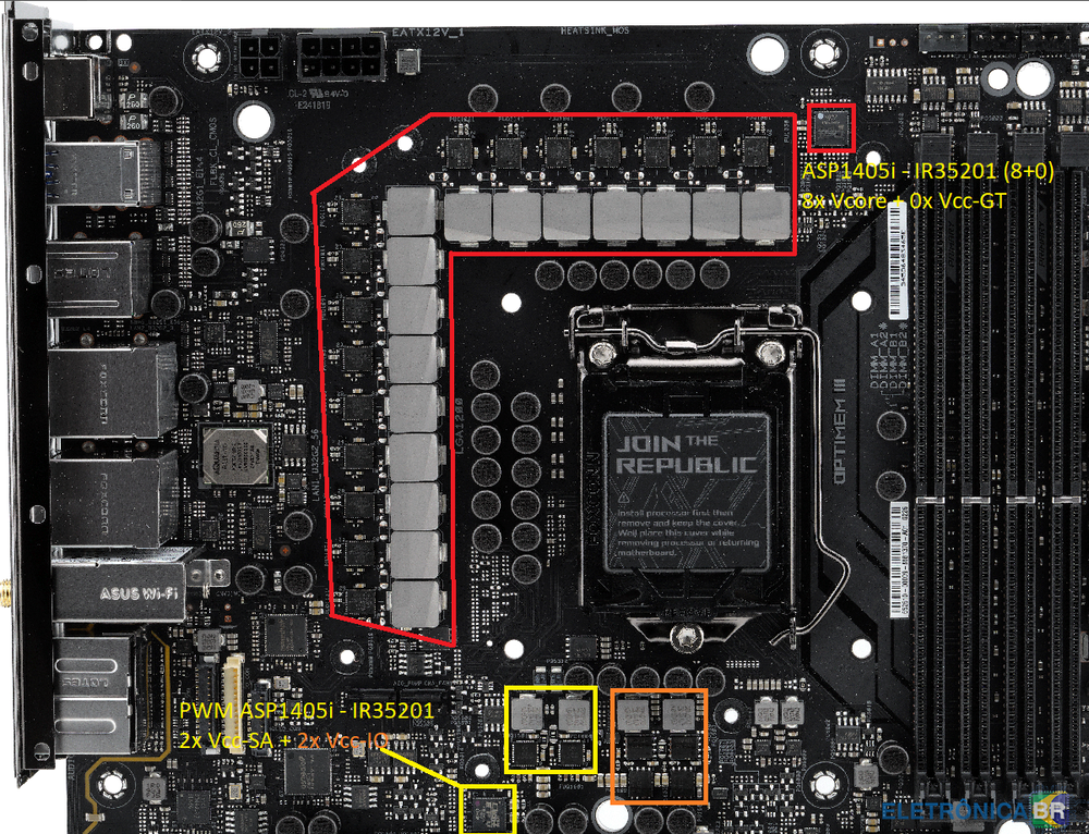 Olá gente gostaria de tirar uma dúvida, como eu faria para saber se uma X fase em específica de um VRM de uma placa mãe é controlada por X PWM? Neste exemplo à seguir vemos que temos um VRM de 16 fases para o Vcore, 0 fases para o Vcc-GT(gráficos integrados), 2 fases para o Vcc-SA e 2 para o Vcc-IO. E temos 2 PWMs que controlam essas 4 rails, porém como eu faço para saber exatamente qual fase em si é Vcore, qual é Vcc-SA, no caso desta placa mãe(como exemplo) eu já sei porém como eu faria para identificar em uma placa mãe que eu talvez não tenha o datasheet do PWM? Neste exemplo dessa ROG Z490 da asus vemos que eu já marquei quais são quais porém como eu faria para saber sem os datasheets? por teste de continuidade seria possível? ou medindo a tensão da fase e comparando com o que está setado no BIOS? Como podemos ver no exemplo à seguir, o ASP1405i que nada mais é que um International Rectifier IR35201 possui os pinos 28 ao 35 se não me engano para emitir o pulso do PWM correto? -