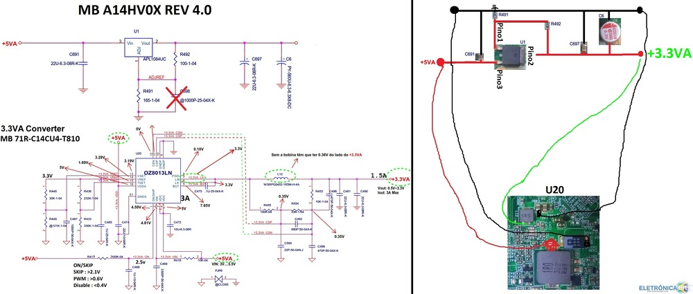 Olá pessoal, passando para deixar uma dica de procedimento que fiz e resolveu o meu problema. Placa mãe ligava quando queria e quando ligava a mesma se desligava antes ou depois de iniciar o sistema operacional, pois bem, fazendo a análise na placa mãe vi que quando o Notebook desligava permanecia a tensão de +5VA e a de +3.3VA caia para 0V ou ficava em 0.80V, aferi todas ás tensões (OK) então fiz a substituição do componente U20 (5 vezes e não resolveu). A solução que achei foi a seguinte, removi o U20 e adaptei um circuito de conversão de tensão (5V para 3.3V) e assim resolveu o problema, Notebook funcionando perfeitamente. Lembrando que quando a tensão caia na bobina L12-3.3V o U20 ficava com o restante das tensões OK.