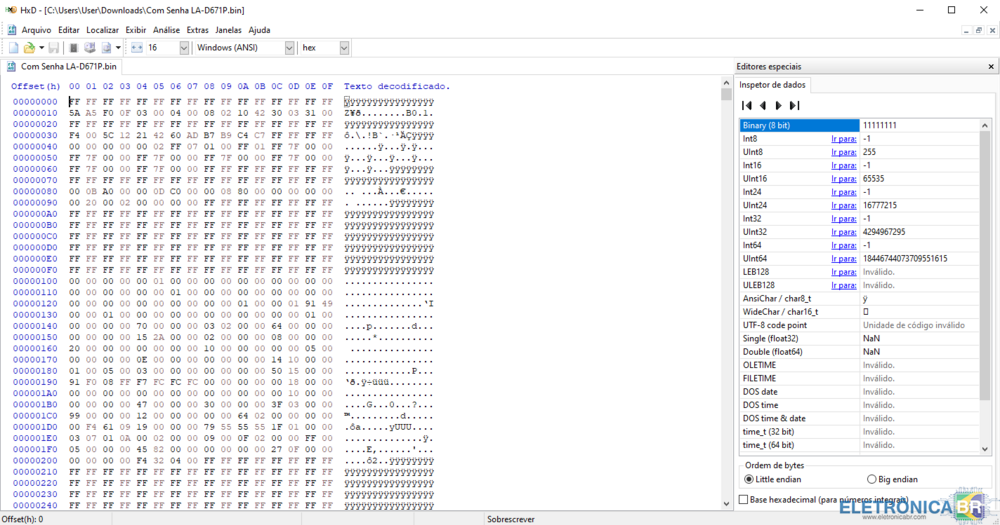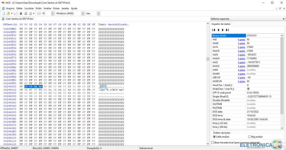 1- Abra no HxD o arquivo de bios que esta com senha 2- Clique em Localizar 3- na aba texto em procurar por digite UUªª 4- Texto localizado 5- Na linha abaixo da que foi localizada terá vários caracteres hexadecimais 6- Selecione a linha toda e vá em editar preencher seleção 7- Preencha com 00 (zero zero) 8- Preenchida com 00 Agora é só ir em salvar como colocar um nome para salvar com extensão .bin e pronto, bios sem senha. -
