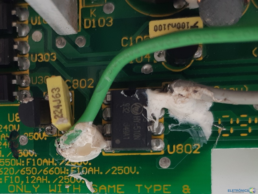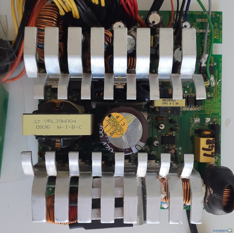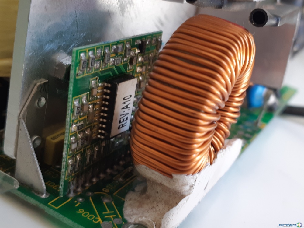 Prezados, Estou com uma fonte XFX 650 W XXX Edition modular na bancada. Ela tem 5VSB, chega até a ligar, mas desarma em milissegundos. Ela é protegida pelo CI Hy510n. Fiz um jumper do pino 3 dele com o GND e a fonte partiu, mas apresentando tensões altas nas saídas. Barramento de 3,3 com 3,9V, o de 5V com 6,0V. Quando fui medir a saída 12V a ventoinha deu um pico de rotação e a fonte desligou, não deu tempo de medir. Testei os capacitores do secundário, todos ok. A bobina toroidal da saída parece íntegra, sem escurecimento ou danos na isolação dos condutores e não há curto entre enrolamentos de tensões diferentes (ver última foto). No primário, não consegui remover os transístores para testá-los individualmente, mas verifiquei que não há curtos. O capacitor da entrada está bom. O TL431 foi testado e está bom. Minha suspeita recai sobre o CI PWM principal (UCC28515DW na placa filha acima) ou o acoplador óptico de realimentação da tensão com fuga, pois funcionando ele está.- 3 respostas