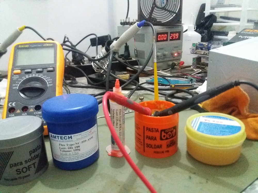 Eu fiz os testes de condutividade de uns fluxos baratinhos e mesmo injetando 30v com as duas pontas de prova a 1mm uma da outra imersas na pasta, não passou sequer 1mA de corrente, ja testei com escala de diodo antes e nada também. E todos eu comprei por preço de banana, com certeza são todos falsos. O mais caro foi o AMTECH 559 que paguei 89,00 temers. O BEST paguei 10,00 O Soft paguei 10,00 O Yaxun foi 20,00 O AMTECH 223 foi 20,00 Eu vi o seguinte tópico no eletronicabr e também quis ver se os meus conduziam, e não conduzem. Claro que a formula do meu fluxo best com certeza é diferente da dele. Mas isso que chamou a antenção. Mesmo assim será que é seguro usar mesmo esses fluxos que não conduzem? Segue a imagem.-