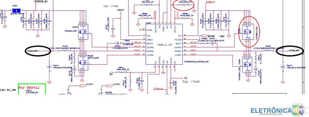pessoal esse notebook não liga, ao conectar a fonte a mesma entra em proteção, conectei a fonte externa e vi que o curto estava na linha dos 3 e 5V, aferi dois fets e o curto estava no PQ401, removi troquei e o curto sumiu, ao ligar nada deu, sem os 3 e 5V. olhando com mais calma percebi que o PWM esta sem Vin ( vi que a trilha ta danificada). Isso não vem ao caso agora por conta da situação(O CURTO). Removi os fets de alta e aixa da linha PQ 401, 402, 403, 404, PU401 e as PL's 401,402 e vejo um curto ainda, vou postar onde tem o curto. gente onde ta o curto é onde circulei, medi em relação ao terra -