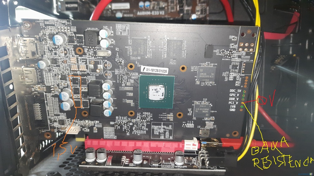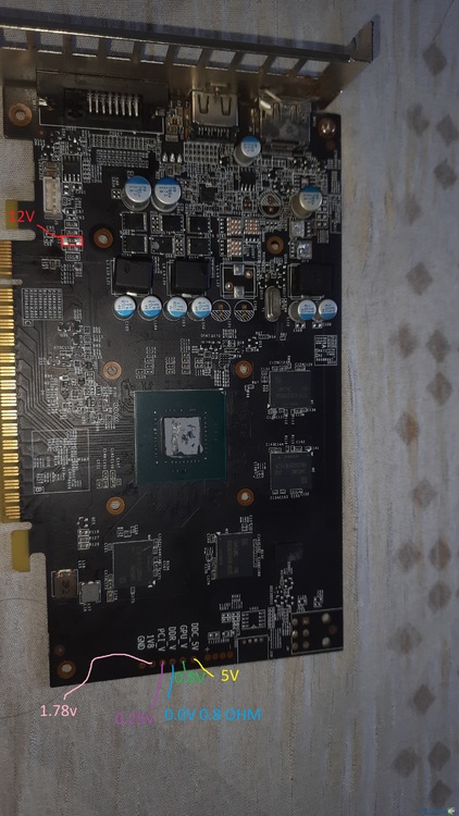 Boa tarde, estou com essa gtx 1050ti, liguei ela no cabo riser e peguei essas informações. PCIEXPRESS; 12V está ok 3.3v está ok 5v está ok Essas são as medições daqueles furinhos da lateral. Pci_v ----------- 0.25v e 11ohm (aqui ele estava sem voltagem nenhuma, mas apos uma limpeza na placa subiu para 0.25v) Gpu_v----------- 0.8v e 1.5ohm Ddr_v------------0v e 0.8ohm 1v8 --------------- 1.78v é 425ohm Após um tempo percebi o aquecimento desses mosfets perto da pl19, 1 deles em curto, e o outro não eles estão fora da placa. -