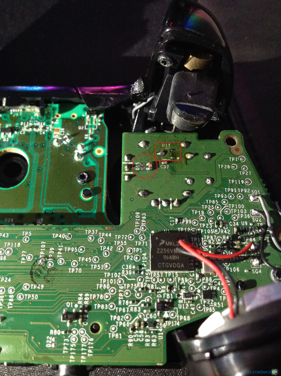 Abri o controle e fui ver qual era o problema... Esse componente atrás, que faz proximidade com o imã na parte do gatilho tinha sumido. (Provavelmente por descuido meu, durante a troca do analógico) Devo ter arrancado.