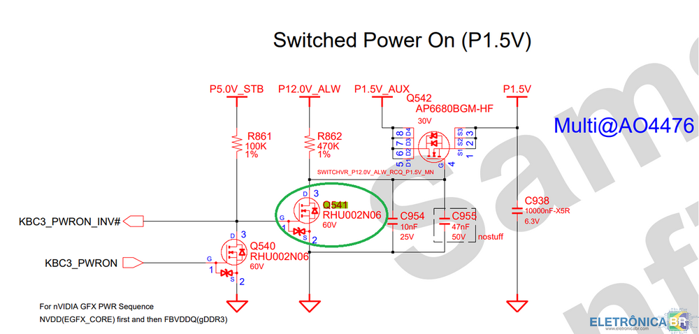 Ola, estou com um RV411/ BA92-07701B Jinmao-L 1.2 Tem todas as voltagem corretas porem o pwm nao aciona os mosfet do cpu vrm Como não tem esquema da placa nessa versão estou me baseando nos board view e esquema do Jinmao-L 1 RC411 onde a pcb é idêntica e so muda pouca coisa como nomes de alguns do componentes porem a função é a mesma mas nao consigo saber o porque do pwm nao acionar os mosfet. Testei eles com multímetro fora e chaveiam certo, o Cooler fica na velocidade Máxima e processador esquenta. Primeiramente encontrei problemas no Q542 onde passava os 1.5v e foi trocado (não tinha Tensão no pinos 1234) após a troca deu os 1.5V e processador esquenta bem. O consumo da Fonte ta 19V 0.53A com processador e cooler sem é 0.12A e 0.8A sem o cooler Tentei trocar o PWM que no esquema fala que é o ISL62882 HRTZ-T porem o que tava na placa é o ISL62882C HRTZ-T(consegui um igual novo) porem continua mesma coisa não da tensão nas bobinas da CPU. Depois de procurar muito achei problemas no Q541 onde matava tensão para o pino 4(gate) onde do Q542 onde ficava apenas 0.50V a 5V fazendo ele para de mandar 1.5V após um tempo. No multímetro nao testar ele direito eu creio, mesmo fora na o deu sinal de problemas. Resolvi retirar ele pq pelo visto é penas para aterrar o 12V_ALW quando ta standby para ver se tensão mudava e ela ficou estabilizado em 6.3V a tensão 1.5 presente o tempo todo quando ligado. como nao achei um para por lugar creio que nao seja a falta dele que ta impendido de ter os 0.88V na bobina do processador onde o IGFX core tem os 0.88V Aqui são todas tensão medidas no PWM. e eu nao tenho mais ideias do que seja.