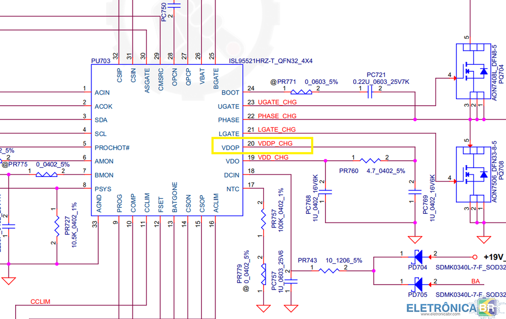 Bom dia Galera, estou com esse notebook na bancada, que ao ligar a fonte o mesmo aquece o PU703 [PWM CHARGER] - (ISL95812HRZ-T) Retirei o PC768, PR760, PC769 que estavam apresentando curto na linha. Identificamos que a linha oriunda da VDDP_CHG apresenta curto. Minha dúvida é a seguinte: Será que o problema está no PU703? Os outros pinos do PU nenhum apresenta curto, somente o pino 20 (VDOP)