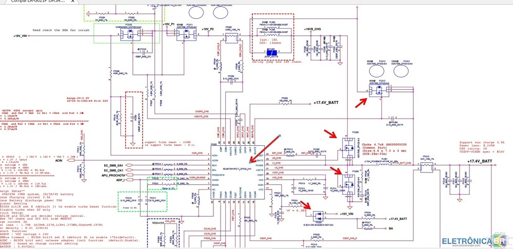Fala galera! Tô com essa máquina que comprei na mão de um cliente julgando ser fácil de resolver e tô tomando uma canseira dessa placa.. rs Já resolvi esse mesmo tipo de problema outras vezes mas dessa vez não sei que zorra tá acontecendo que não dá jeito Consigo ligar o note tanto pela bateria quanto pela fonte, mas nunca simultaneamente.. quando conecto a fonte assimétrica há um choque de tensões, ela cai pra 10~13v e consome toda corrente indicando CC Todos os componentes marcados em vermelho já foram trocados Já testei com outra bateria e o problema persiste O que aconteceu com essa máquina é que caiu um pouco de água justamente na área do CI Charger PU301 OBS: não tenho osciloscópio Esquema: -